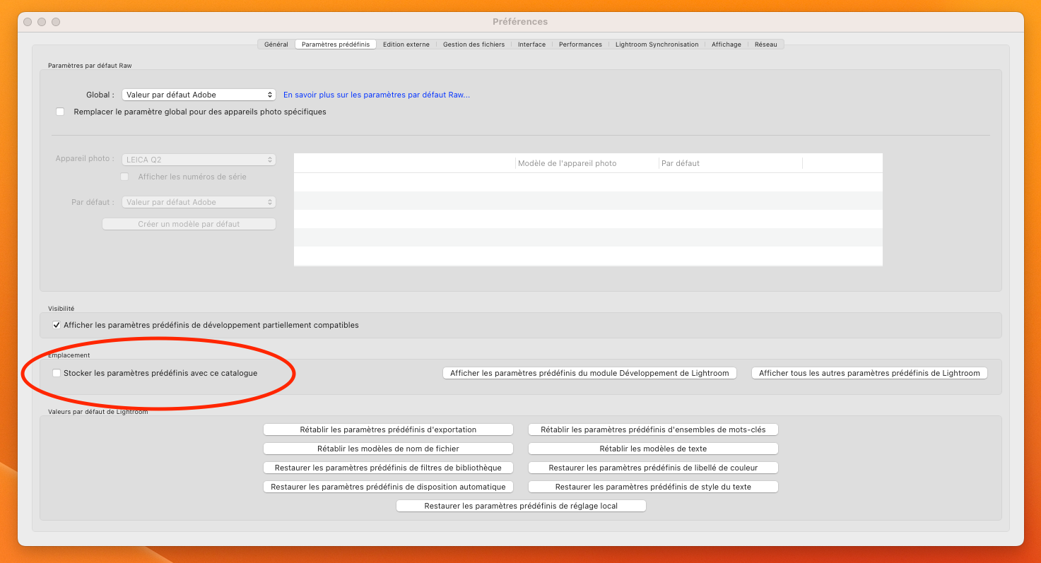 Assurez-vous que la case "Stocker les paramètres prédéfinis avec ce catalogue" soit désactivé dans l'onglet "Lightroom Classic > Préférences > Paramètres prédéfinis".