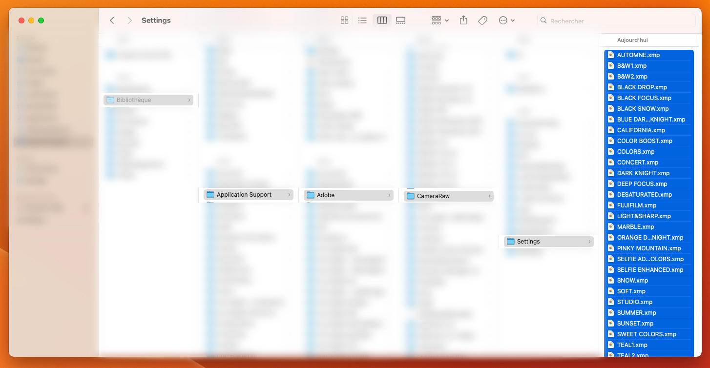 Cliquez ensuite sur le bouton "Afficher tous les autres paramètrs prédéfinis de Lightroom" > revenez ensuite dans le dossier "Camera Raw" > puis "Settings" et copiez les fichiers .XMP du pack de presets dans ce dossier.