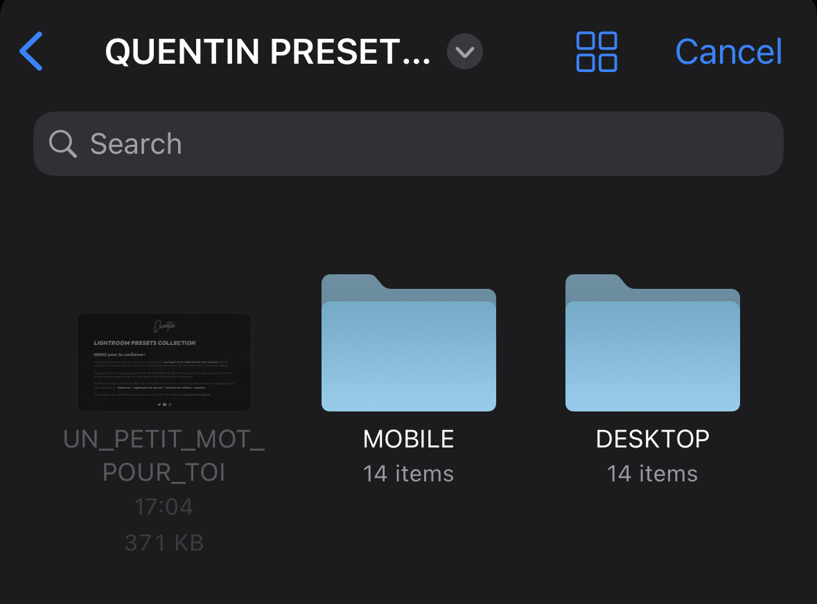 La première solution consiste tout simplement à importer les presets sur Lightroom CC sur votre PC, ils seront automatiquement ajoutés à votre bibliothèque de presets sur votre smartphone. Si vous n'avez ni de PC, ni Lightroom CC sur PC ou bien que vous voulez tout faire via votre smartphone, voilà les étapes à suivre.